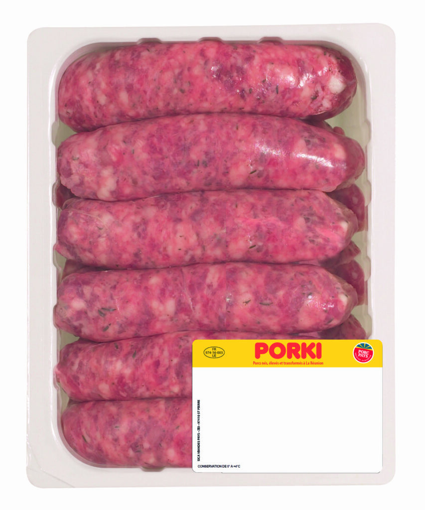 Saucisses : : viande de porc, eau, sel, dextrose, arômes, plante aromatique, ail, épice, betterave, concentré de jus de fruit, maltodextrine, extrait d’épices, boyau de porc.